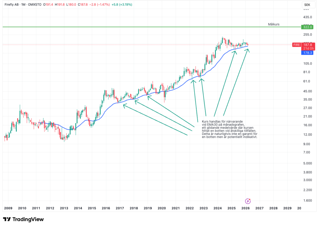 På månadsgrafen framgår att Firefly sedan 2013 i huvudsak har handlats i en långsiktig uppåttrend ovanför EMA30, med ett kort trendbrott i samband med Covid-19-kraschen. Nedgången följdes dock relativt snabbt av en återgång till den långsiktiga uppåttrenden. Kursuppgången sammanfaller med en kontinuerligt stigande omsättning och vinst per aktie under perioden.