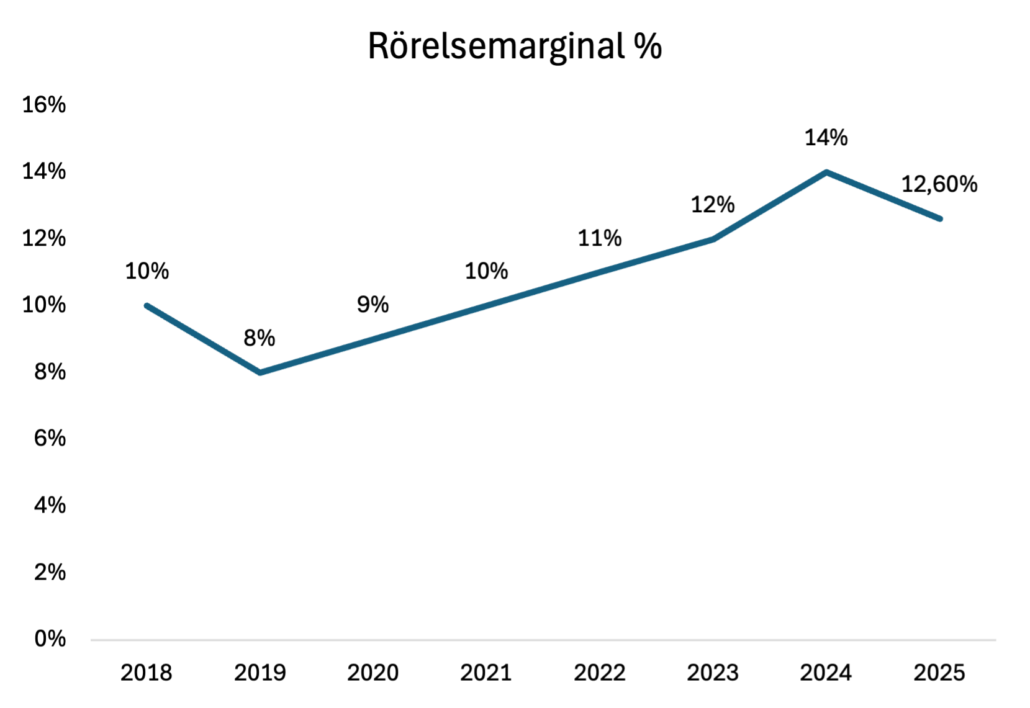 Rörelsemarginalen ökade tydligt mellan 2018 och 2024, från 10 % till 14 %, medan 2025 var något svagare med en rörelsemarginal om 12,6 %. Trots nedgången 2025 ligger marginalen fortsatt över nivåerna före 2023, vilket indikerar en strukturellt förbättrad lönsamhetsprofil.