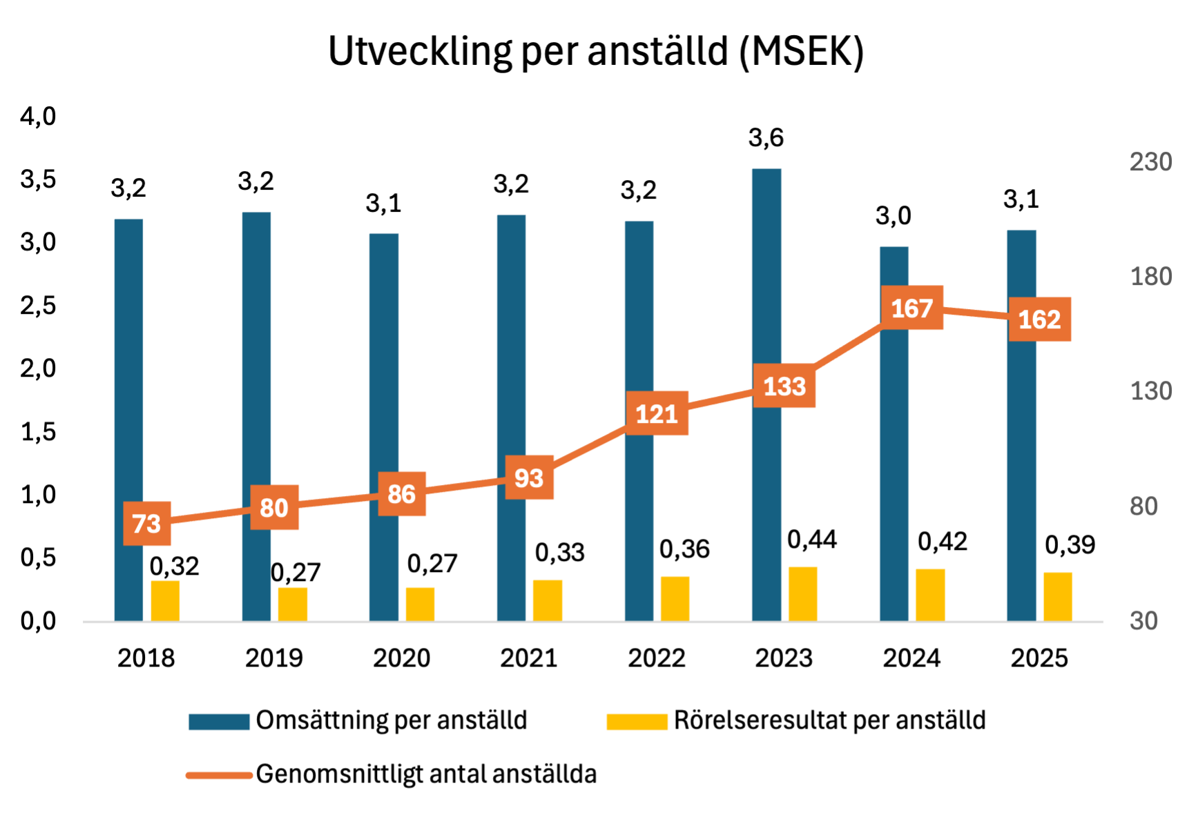 Under perioden 2018-2025 uppgick den genomsnittliga omsättningen per anställd (“GOPA”) till 3,2 MSEK, medan det genomsnittliga rörelseresultatet per anställd (“GRPA”) uppgick till 0,35 MSEK. Bortsett från ett extraordinärt starkt år 2023, då GOPA uppgick till 3,6 MSEK, har nivån varit relativt stabil över tid. GRPA har däremot uppvisat en tydligt positiv trend sedan 2018, från 0,32 MSEK till 0,39 MSEK år 2025. Detta kan delvis förklaras av att en större andel av personalstyrkan utgörs av servicepersonal, vilket generellt är förknippat med högre lönsamhet per anställd eftersom COGS ofta inte ingår.