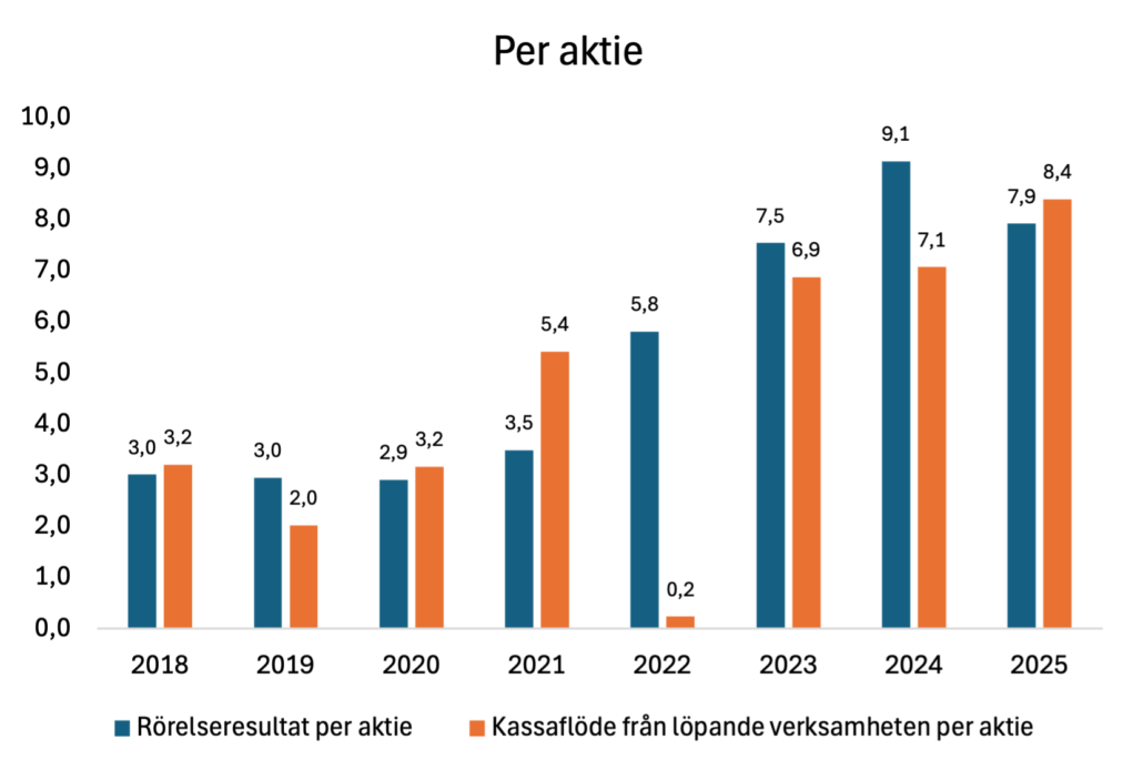 Rörelseresultat per aktie och kassaflöde från den löpande verksamheten per aktie följer en liknande utveckling över tid, vilket tyder på en god kassakonvertering där en stor del av resultatet omsätts i kassaflöde.