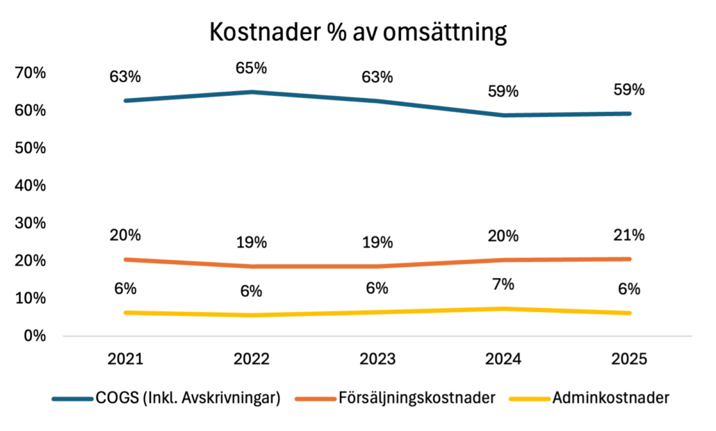 Bruttomarginalen har förbättrats sedan inflationsåren. Den ökade från 37 % år 2021 till 41 % år 2025. Förbättringen förklaras sannolikt inte enbart av ett mer stabilt kostnadsläge utan även av ett stärkt förhandlingsläge i takt med att Bolagets försäljning har ökat. Firefly har dessutom arbetat aktivt med att diversifiera antalet underleverantörer, vilket kan ha bidragit till bättre inköpsvillkor. Den stabila kostnadsstrukturen tyder på god kostnadskontroll trots ökande verksamhetsvolymer.