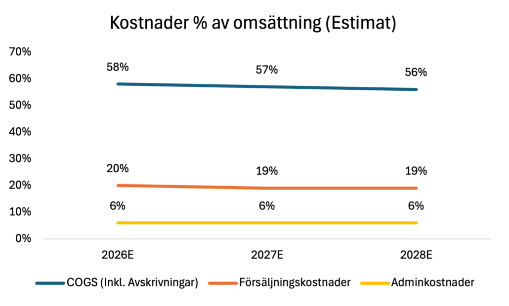 Bruttomarginalen förväntas stärkas successivt från 42 % år 2026 till 44 % år 2028. Detta drivs främst av en högre andel serviceintäkter samt förbättrad skala i verksamheten. Samtidigt antas kostnadsbasen utvecklas positivt, där kostnad för sålda varor successivt minskar från 58 % till 56 % av omsättningen. Förbättringen förklaras även av Bolagets arbete med att diversifiera leverantörsbasen, vilket förväntas stärka inköpspositionen och möjliggöra mer fördelaktiga inköpsvillkor i takt med ökade volymer. Försäljningskostnader förväntas minska från 20 % till 19 %, vilket reflekterar ökad skala i organisationen och en större andel återkommande affärer från befintliga kunder. Administrativa kostnader antas vara stabila omkring 6 % av omsättningen.