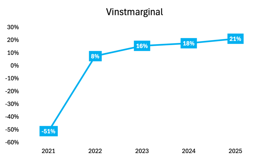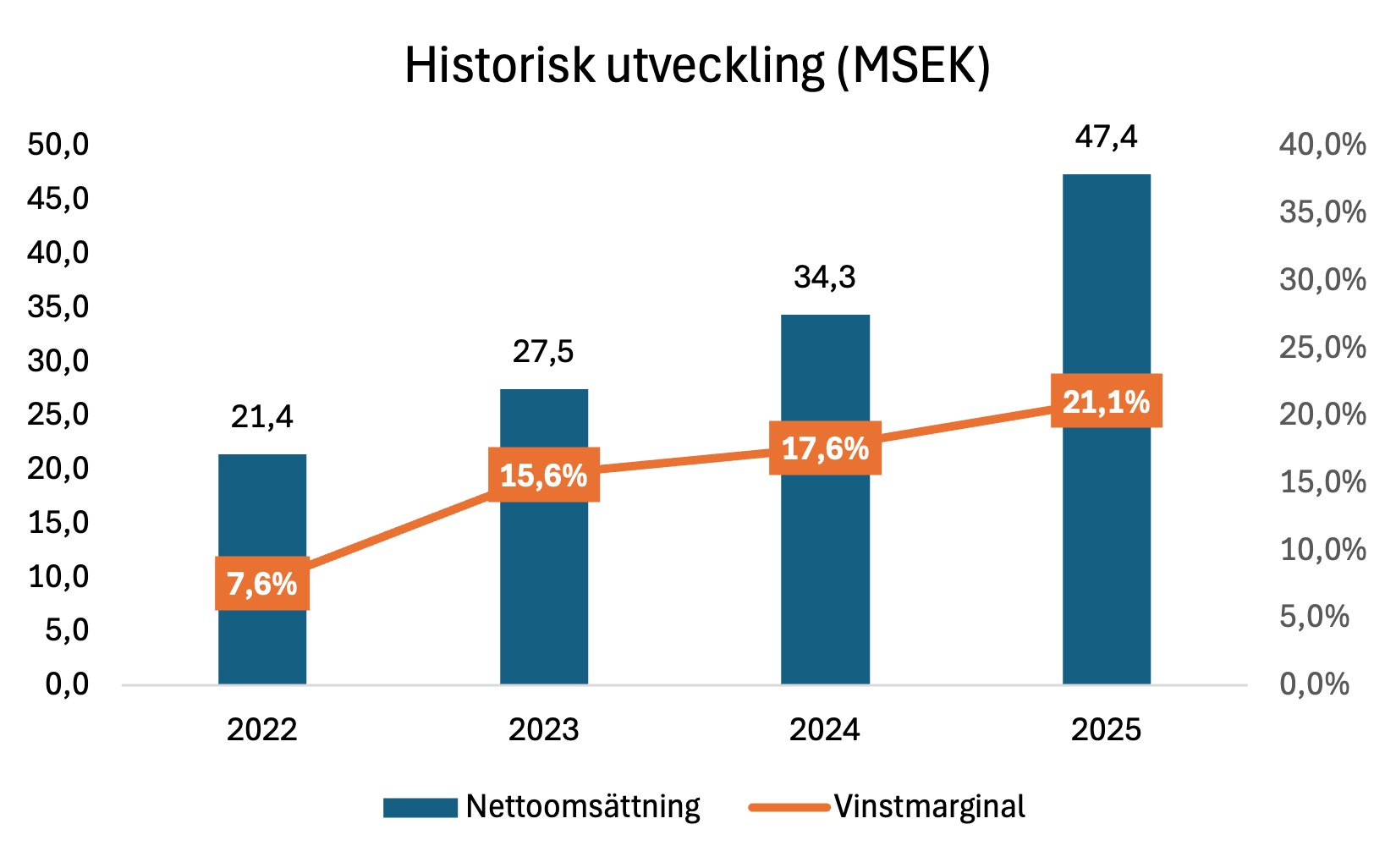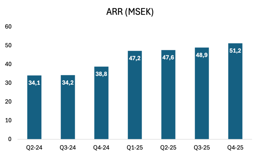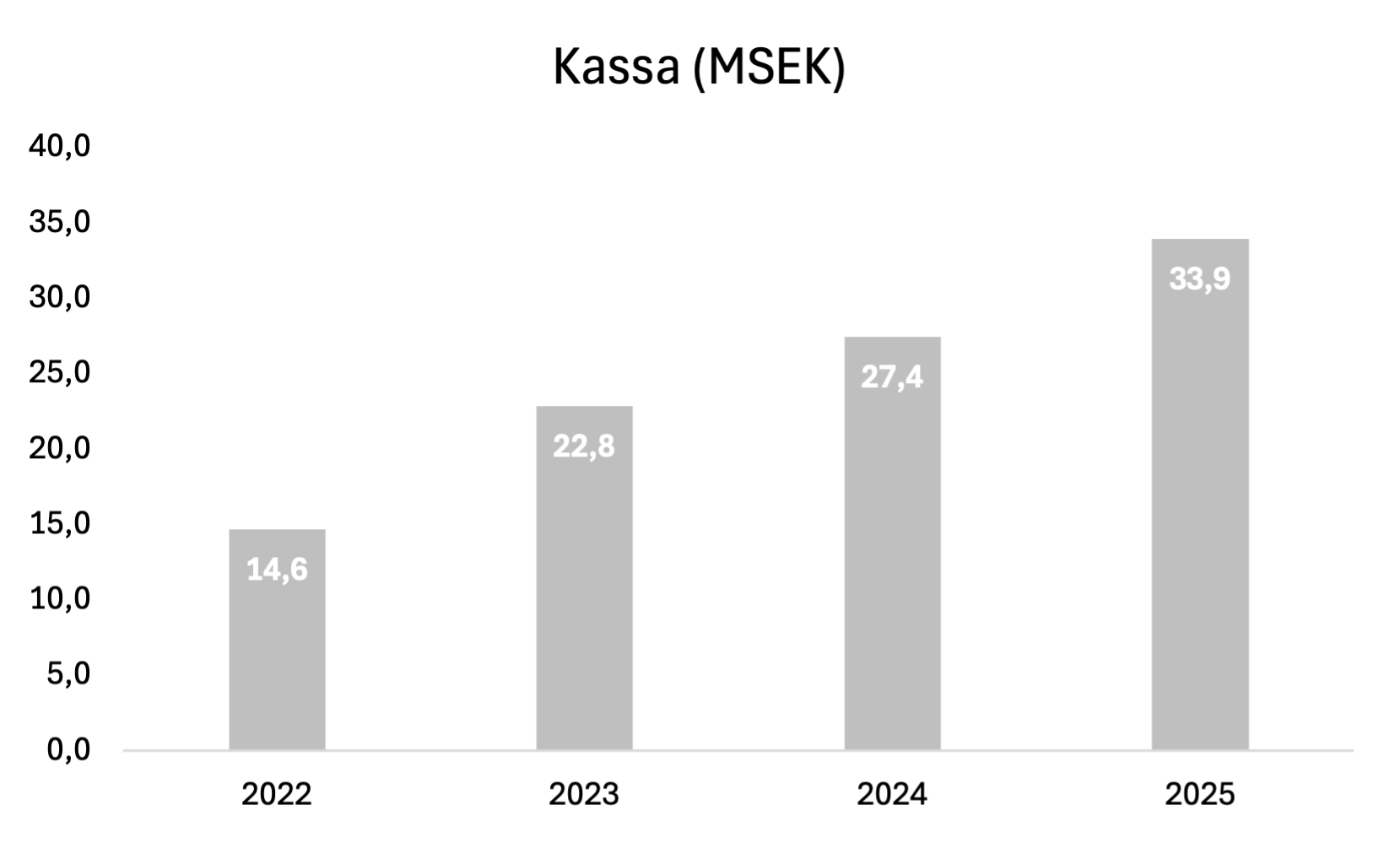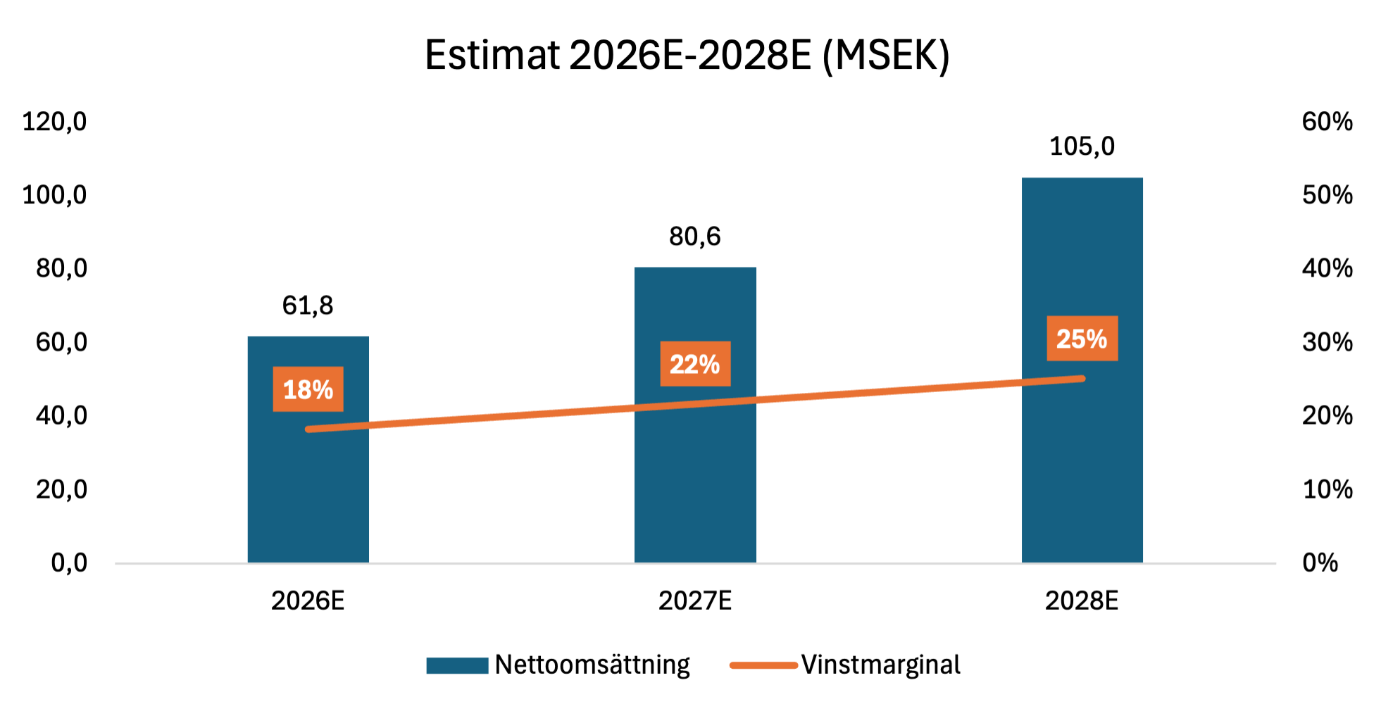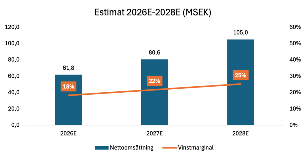 Samtidigt har bolaget genomfört kostnadsbesparingar motsvarande cirka 50 MSEK i årstakt. Dessa åtgärder förväntas få fullt genomslag under 2026, vilket skapar förutsättningar för en tydlig marginalexpansion även vid oförändrade volymer.