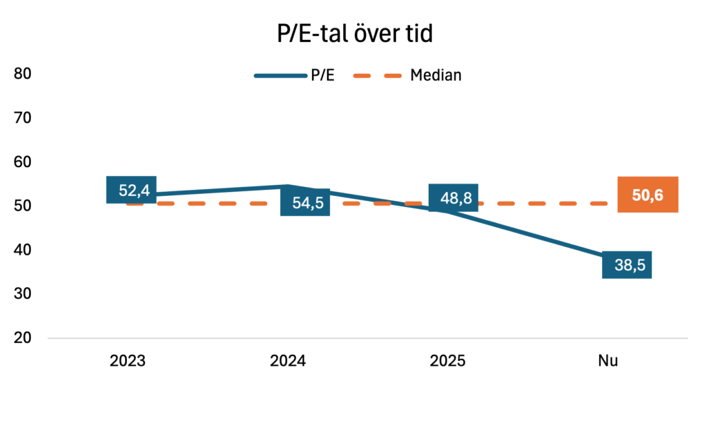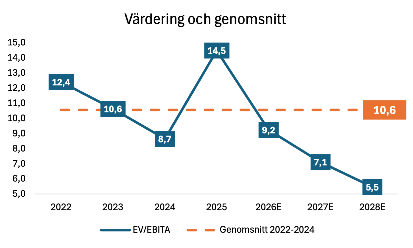 På innevarande års siffror handlas bolaget till en EV/EBITA-multipel om cirka 14-15x, vilket överstiger det historiska snittet. Detta förklaras främst av en tillfälligt pressad resultatnivå under 2025 i kombination med en tydlig förbättring under årets senare del.