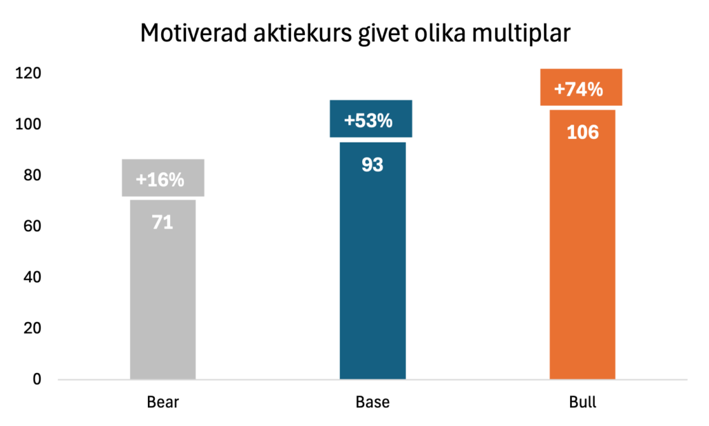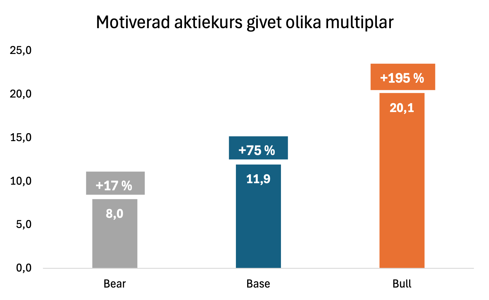 Samtliga scenarier baseras på samma underliggande prognos. Skillnaden mellan scenarierna utgörs enbart av vilken multipel marknaden antas vara villig att betala för bolagets intjäning, vilket reflekterar olika grader av förtroende för den operativa utvecklingen.