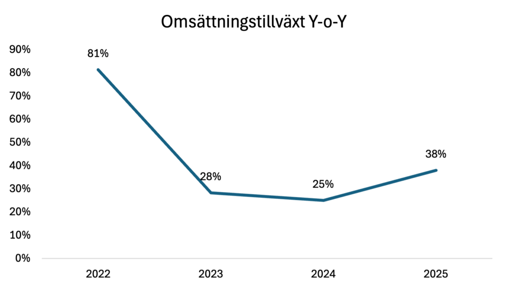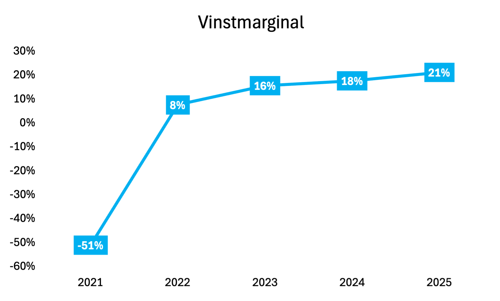 Under senare delen av 2025 har omsättningen återhämtats, men personalkostnadsandelen är fortsatt oförändrad. Det innebär att någon tydlig skalning ännu inte slagit igenom. Samtidigt har bolaget kommunicerat kostnadsnedskärningar, vars effekter ännu inte fullt ut syns i siffrorna. Givet detta finns förutsättningar för att personalkostnaderna minskar relativt omsättningen framöver, vilket talar för ytterligare marginalexpansion vid fortsatt volymtillväxt.