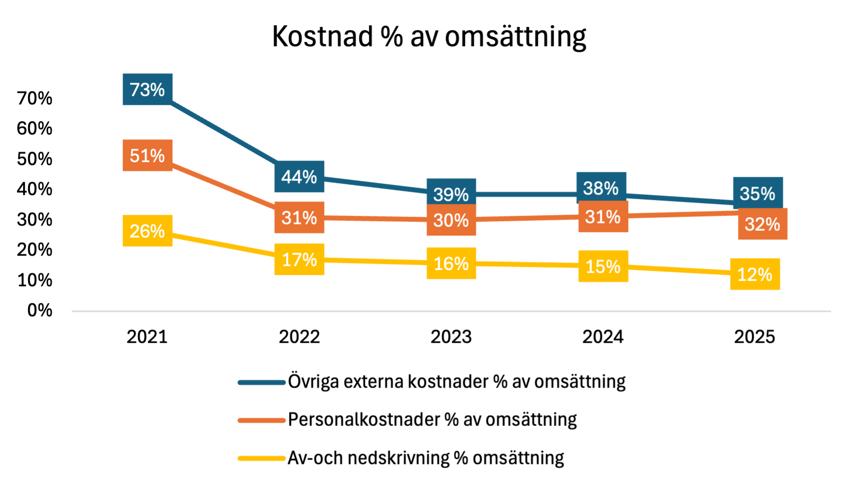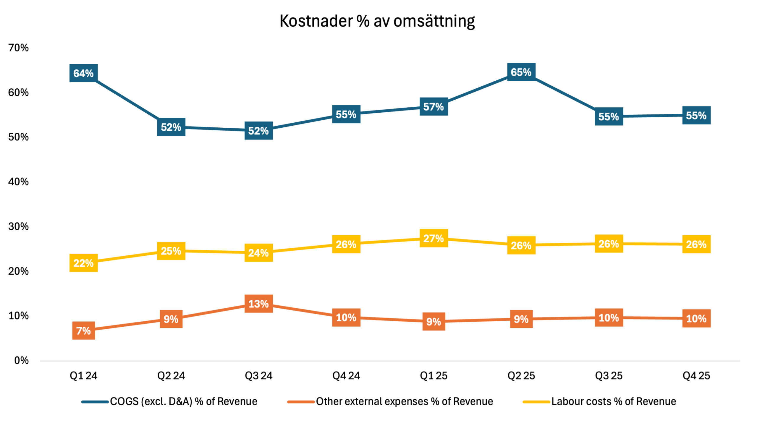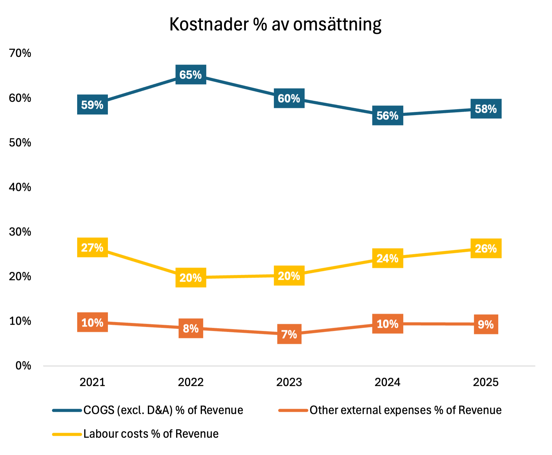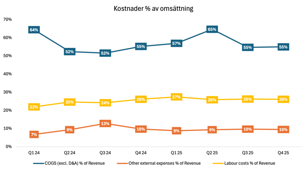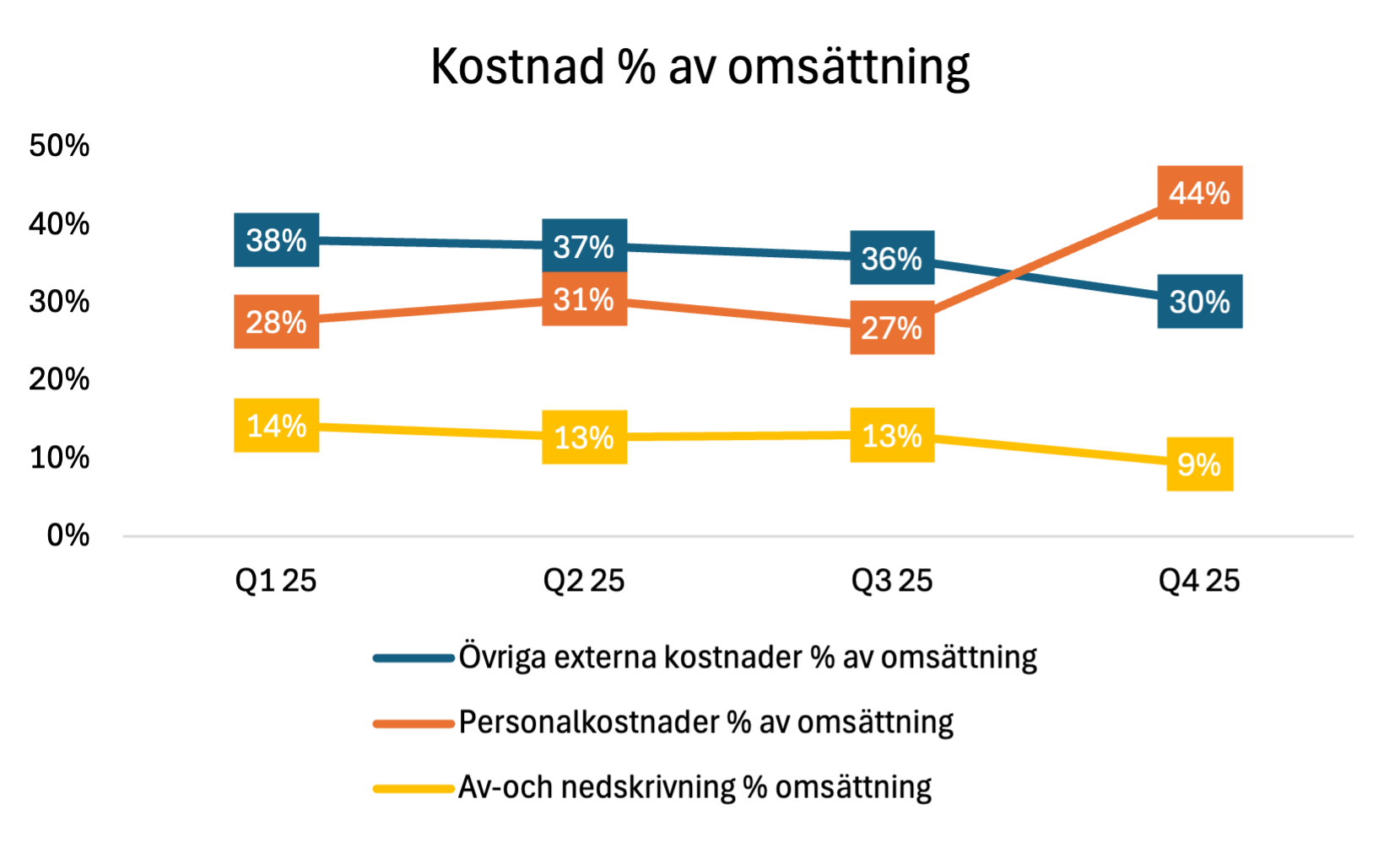 På kvartalsnivå framgår samma mönster. Under de svagare kvartalen 2024 och början av 2025 pressades lönsamheten trots relativt stabila eller sjunkande rörliga kostnader. Samtidigt har personalkostnaderna legat kvar på en i stort sett oförändrad nivå om cirka 26 % av omsättningen, vilket indikerar att kostnadsbasen inte anpassats i takt med de lägre volymerna.