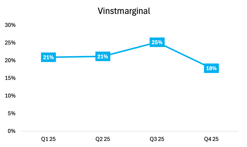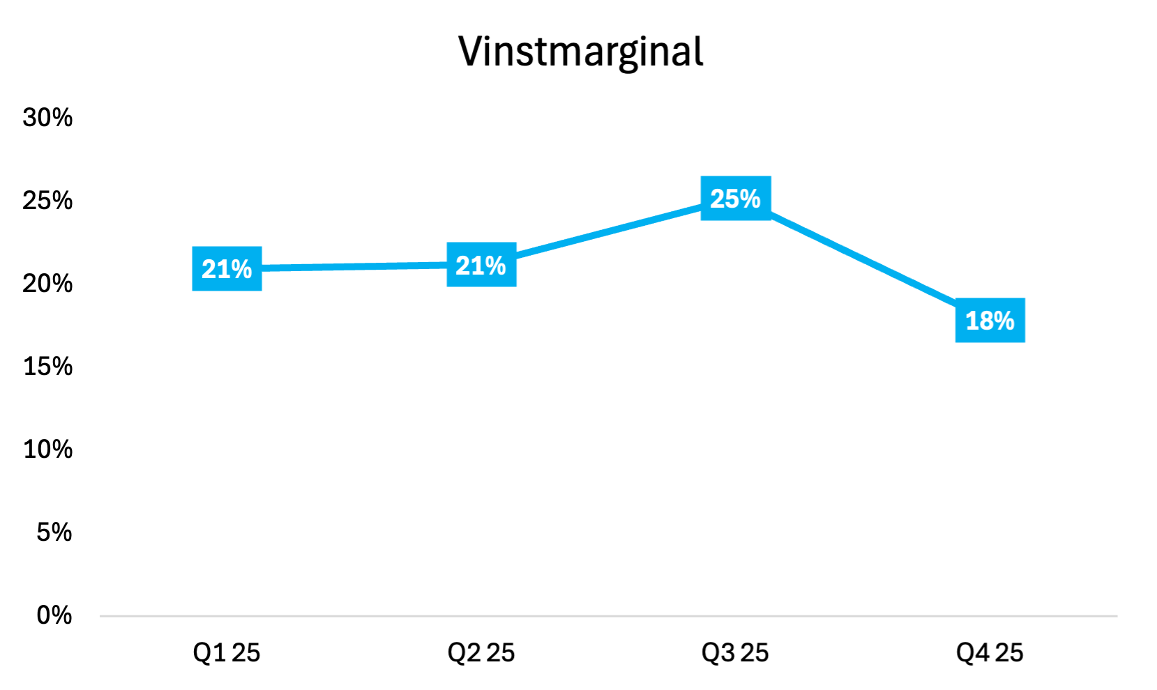 På kvartalsbasis syns en successiv försvagning under 2024 och första delen av 2025, följt av en tydlig sekventiell förbättring under andra halvåret. Marginalerna är fortsatt svaga under stora delar av perioden, men förbättringen mot slutet av året är markant, där EBITA-marginalen utvecklas från -7,4 % i Q3 2025 till 1,3 % i Q4 2025.