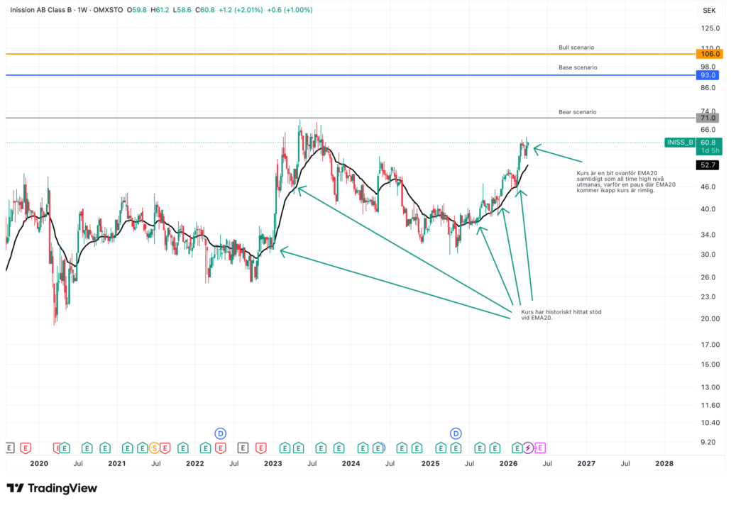 Den långsiktiga trenden är fortsatt positiv, där högre toppar och bottnar kombineras med en förbättrad fundamental utveckling. Eventuella rekyler mot trendnivåer bör därmed ses i ljuset av en fortsatt uppåtgående struktur snarare än ett trendskifte.