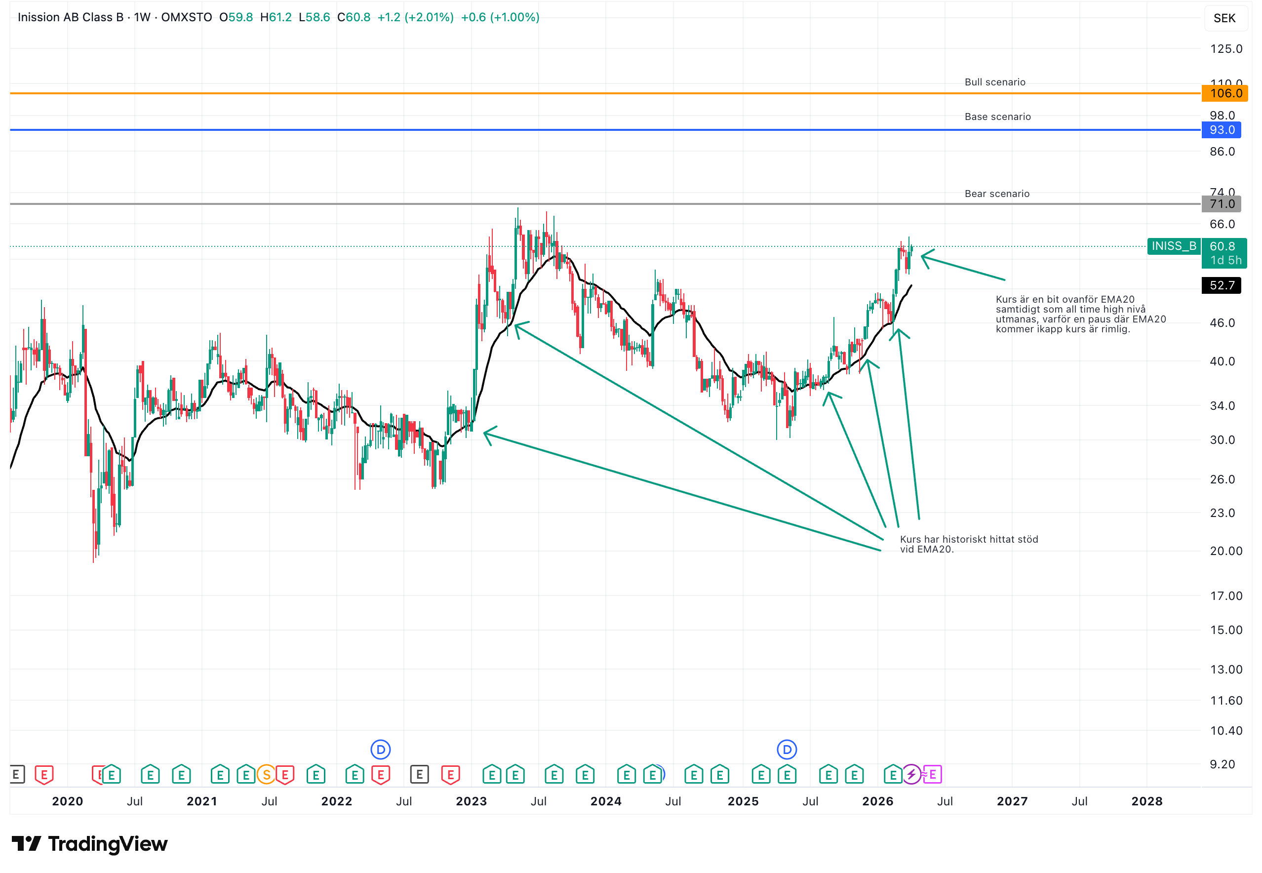 Aktien har historiskt respekterat EMA20 på veckobasis, vilket indikerar en stabil underliggande trend. I dagsläget handlas kursen ovanför denna nivå samtidigt som tidigare all time high testas, vilket talar för att kortsiktig konsolidering eller en rekyl inte vore oväntad.