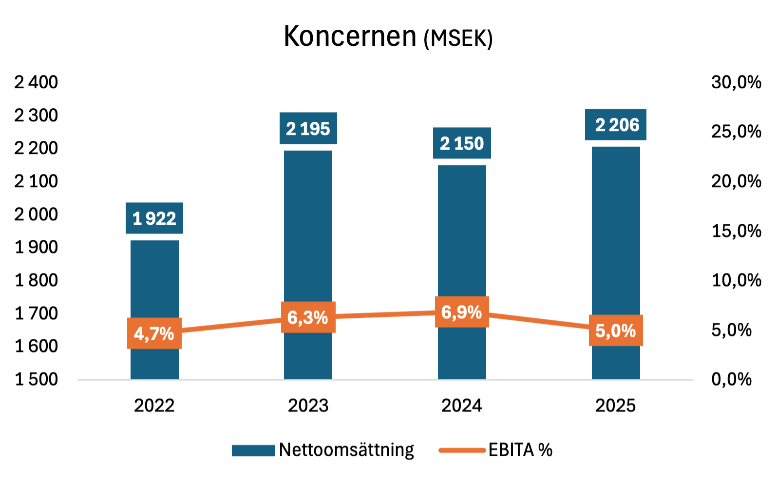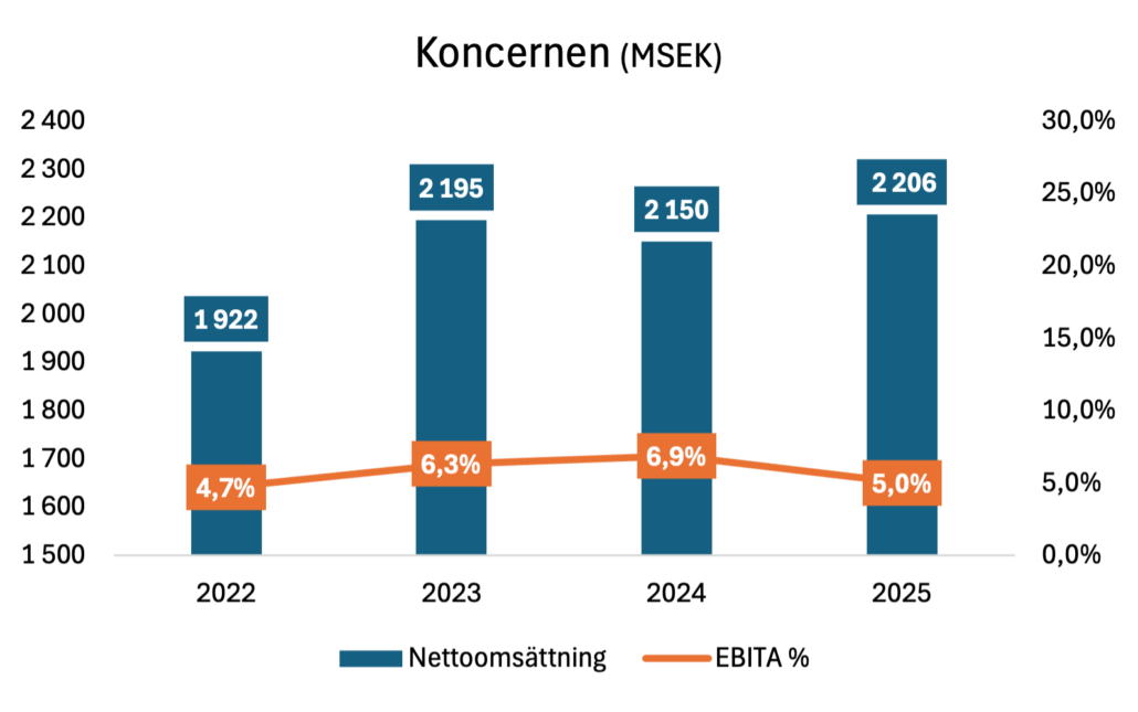 På koncernnivå framgår det tydligt att intjäningsförmågan försvagades när marknaden mattades av. Omsättningen växte starkt fram till 2023, men har därefter i stort sett varit oförändrad kring 2,1-2,2 mdSEK under 2024-2025.