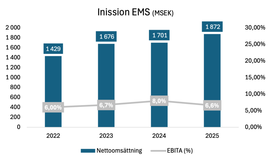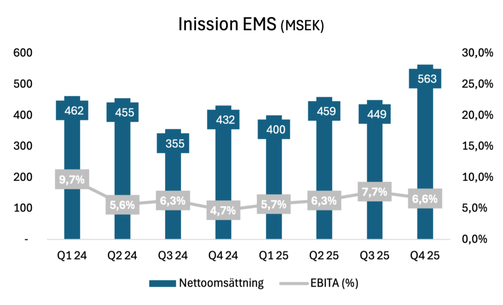 Inission EMS har varit den klart stabilare delen av koncernen genom cykeln. Omsättningen har ökat successivt över tid, och trots en svagare period under 2024 har verksamheten återgått till tillväxt under 2025.