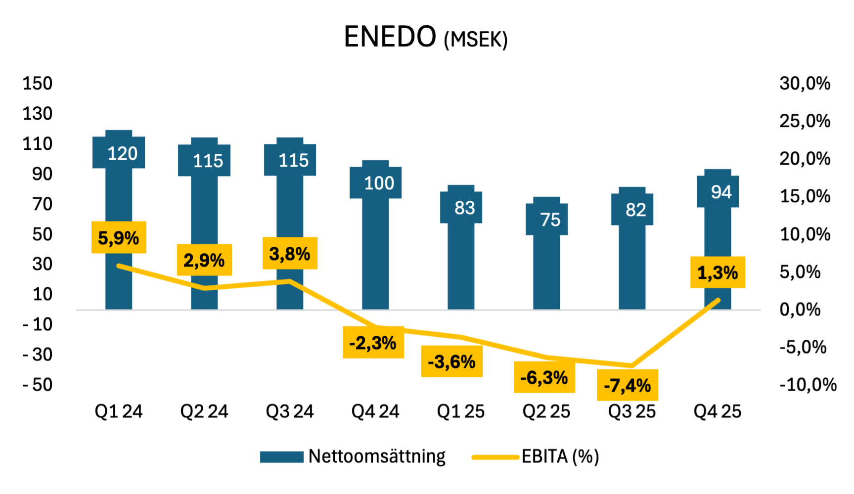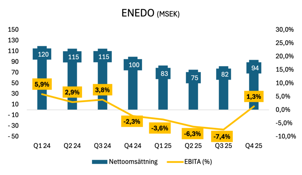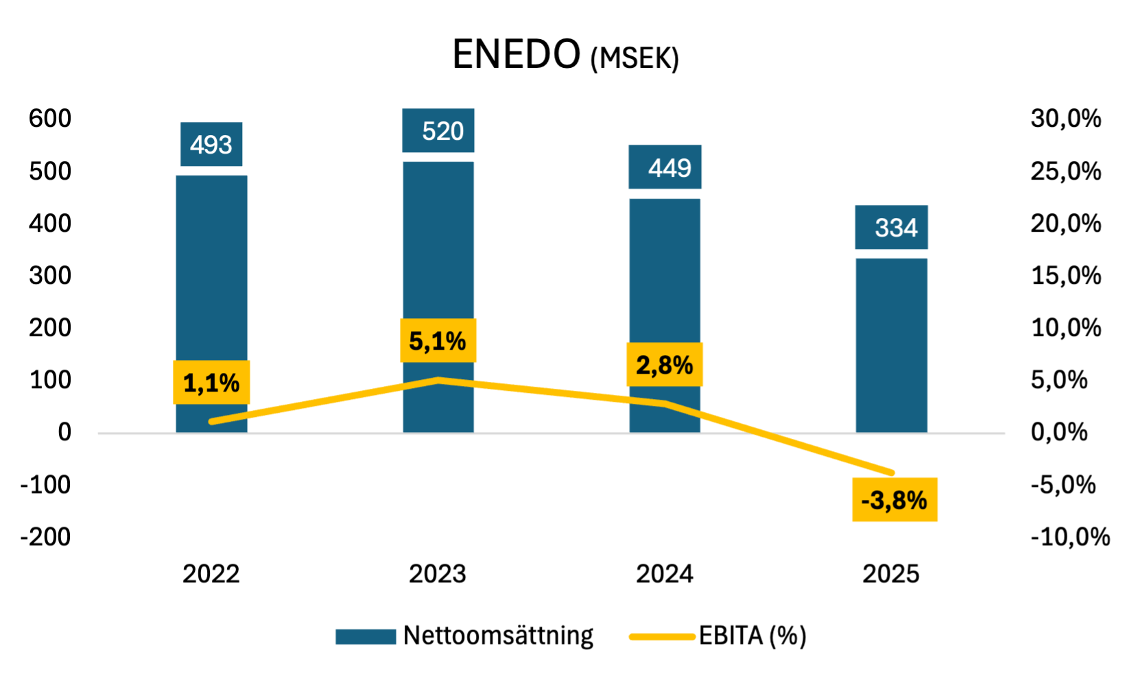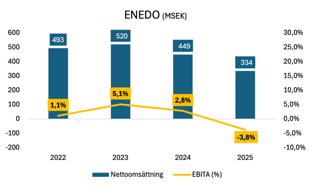 Enedo har utvecklats betydligt svagare och varit den huvudsakliga belastningen på koncernens lönsamhet. Omsättningen har fallit kraftigt sedan 2023, samtidigt som verksamheten gått från positiv till negativ EBITA.