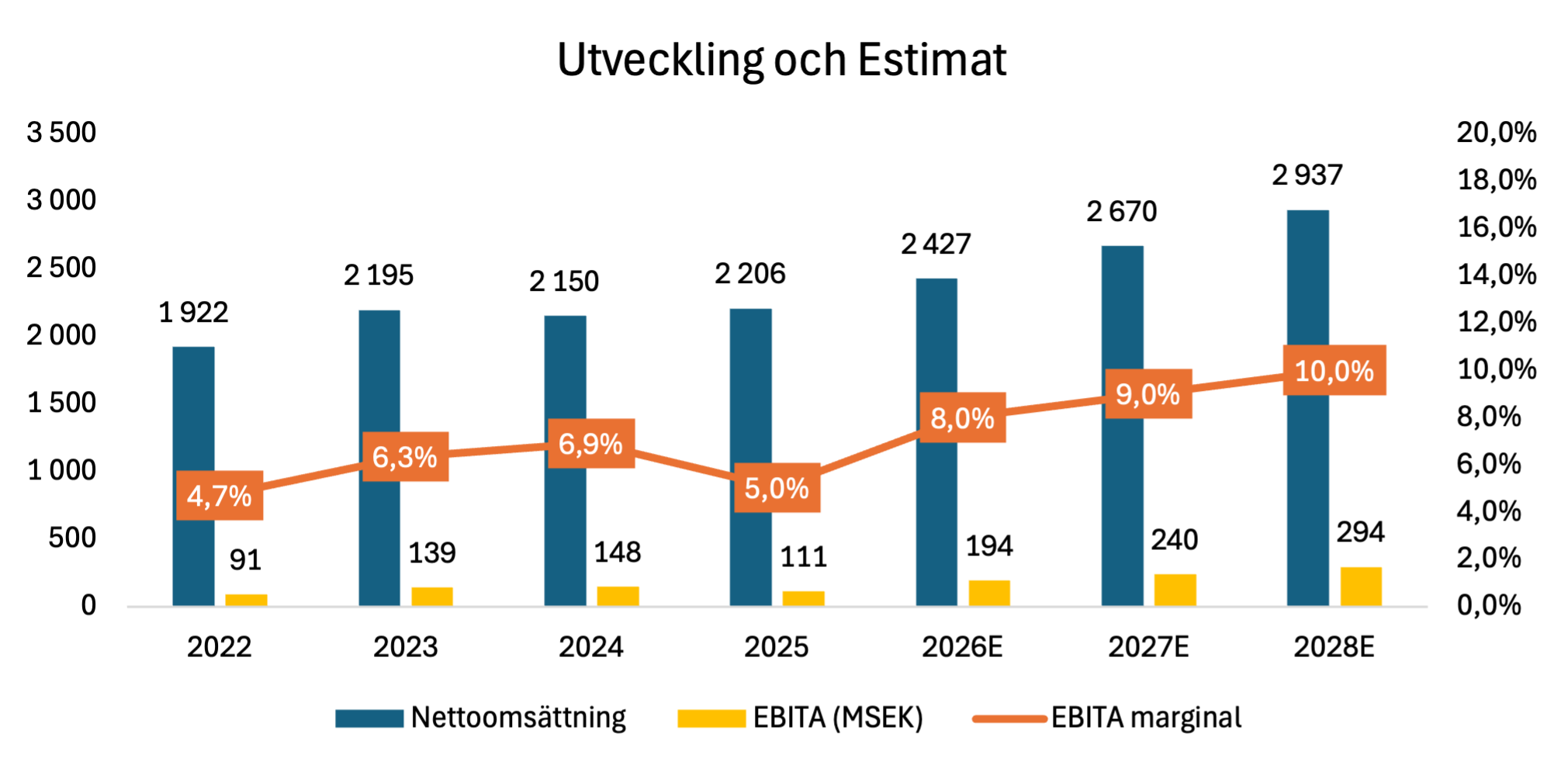 Lönsamheten förväntas successivt förbättras, där EBITA-marginalen estimeras uppgå till cirka 8 % 2026, 9 % 2027 och 10 % 2028. Förbättringen drivs främst av ökat kapacitetsutnyttjande inom affärsområdet Inission EMS, där marginaler historiskt har legat i intervallet 6-8 % vid högre volymer. Detta indikerar att nuvarande nivåer, omkring 5 %, fortfarande reflekterar ett underutnyttjat läge snarare än en strukturell försämring.