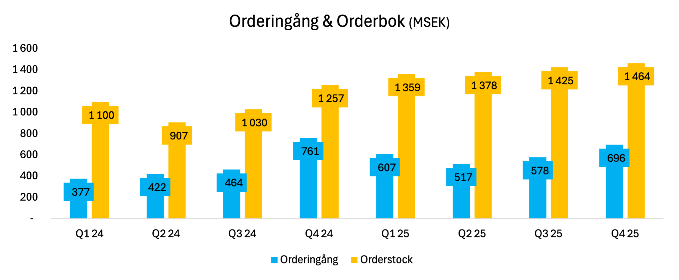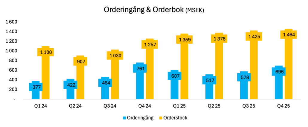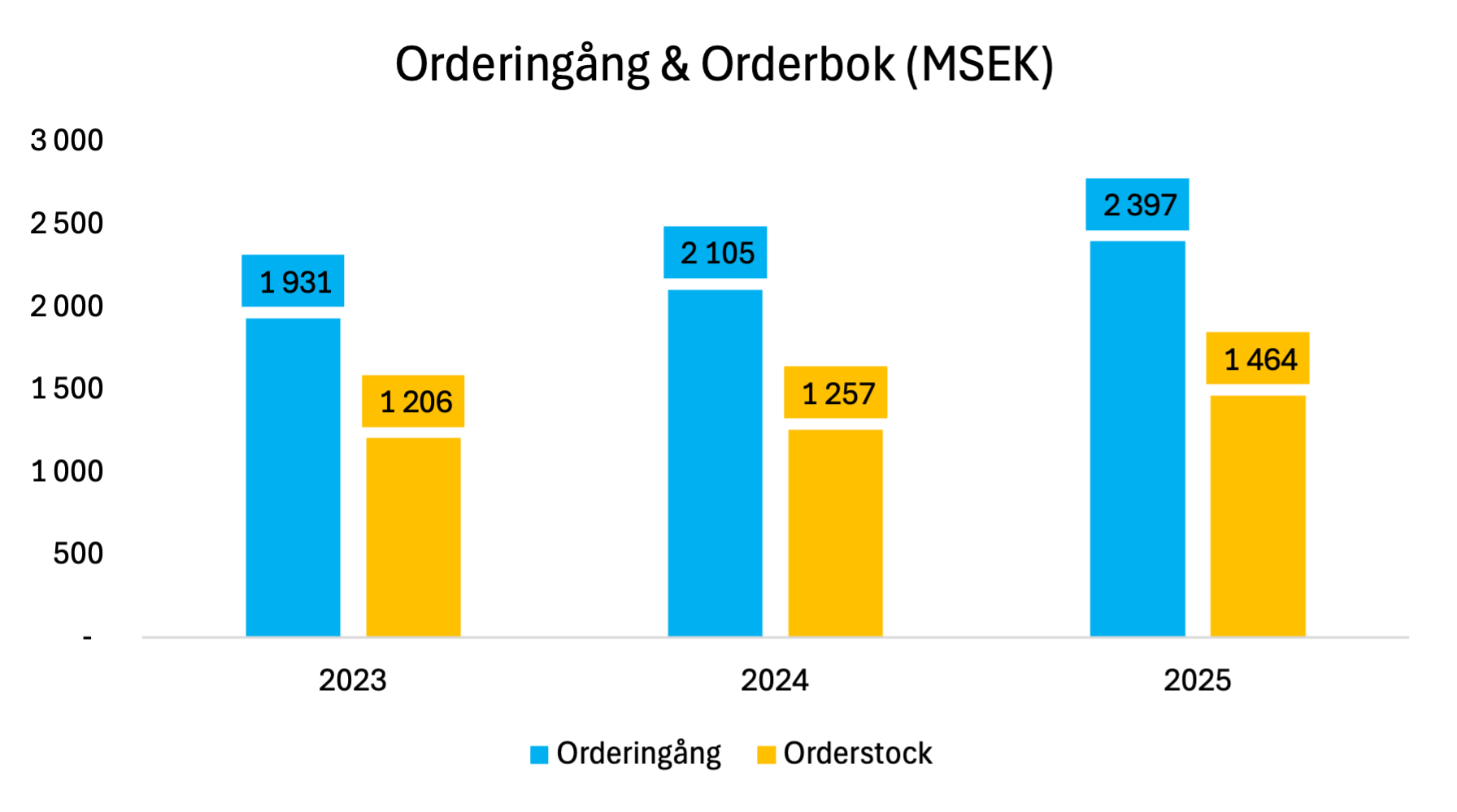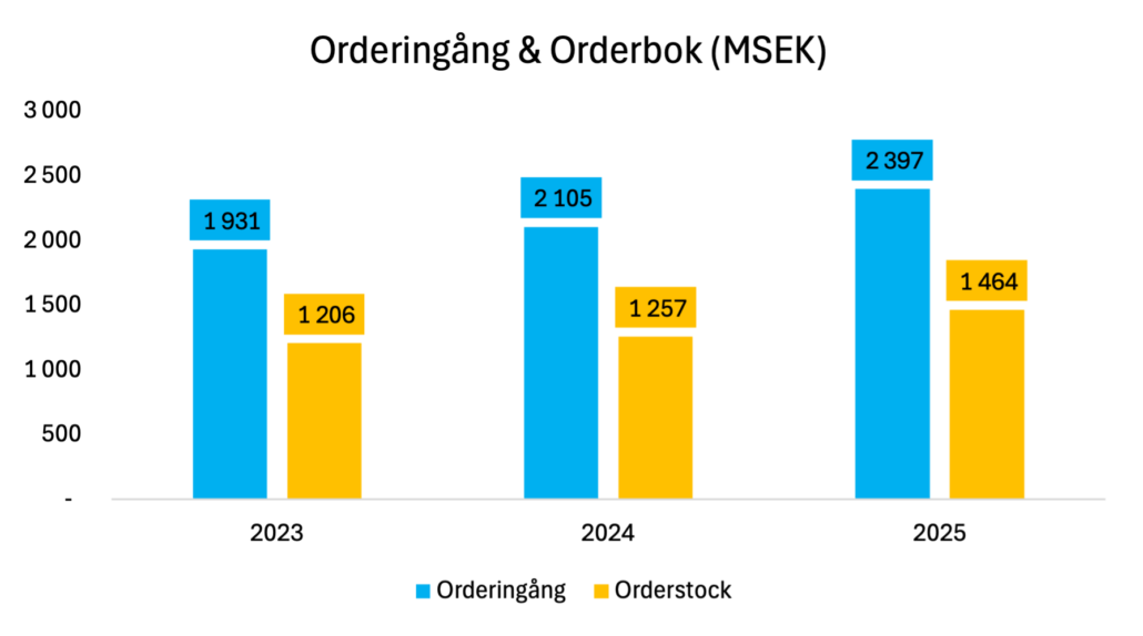 På årsbasis har orderingång och orderstock utvecklats positivt över perioden, samtidigt som book-to-bill förbättrats från nivåer under 1,0 till omkring 1,1 under 2025. Det indikerar att orderingången nu överstiger faktureringen och att efterfrågan successivt stärkts.
