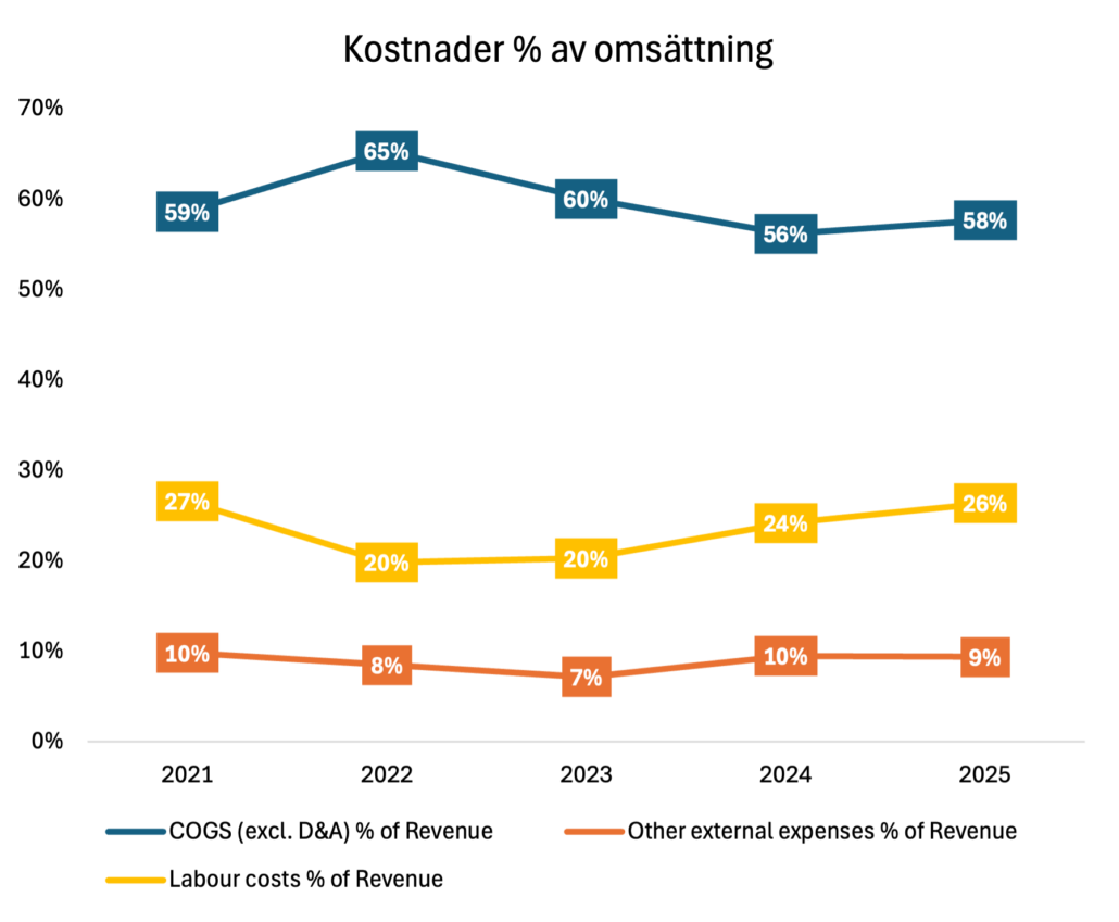 Den svagare lönsamheten under 2025 förklaras i stor utsträckning av kostnadsstrukturen. Trots att kostnader för råvaror och förnödenheter har minskat under perioden, har EBITA-marginalen pressats, vilket indikerar att marginalförsämringen inte drivs av externa insatskostnader.