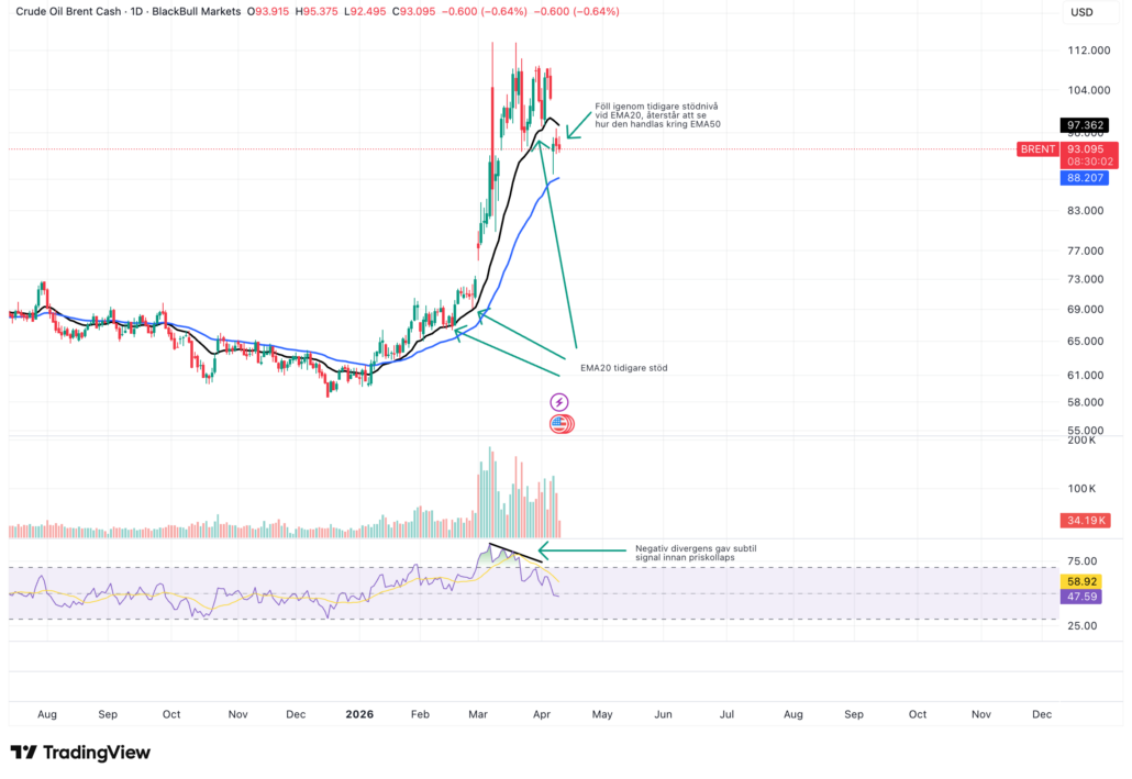 Vi såg redan innan den senaste vapenvilan hur oljan handlades med negativ divergens i RSI. Givet utfallet med pausade attacker föll oljan, inte oväntat, ned under EMA20. En potentiellt viktig nivå framåt är EMA50.