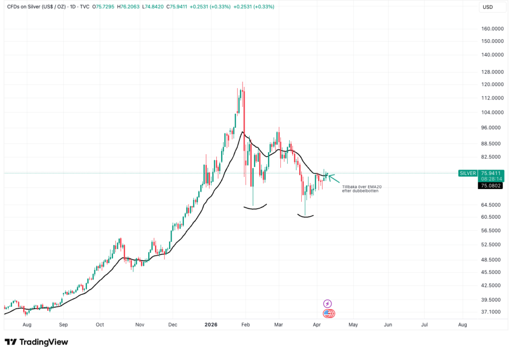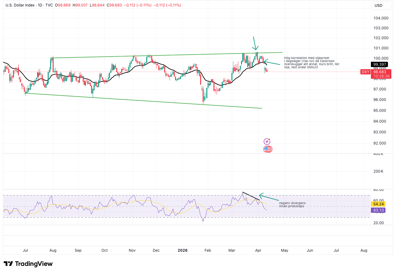 Vi har sett en tydlig korrelation mellan dollarn och oljan sedan krigets inledning. Likt räntan och oljan handlades dollarn inför vapenvilan med avtagande momentum. I takt med att riskbilden förbättrats har dollarn brutit ned under EMA20, vilket öppnar för ökad riskvilja på de globala finansmarknaderna om trenden fortsätter ned.