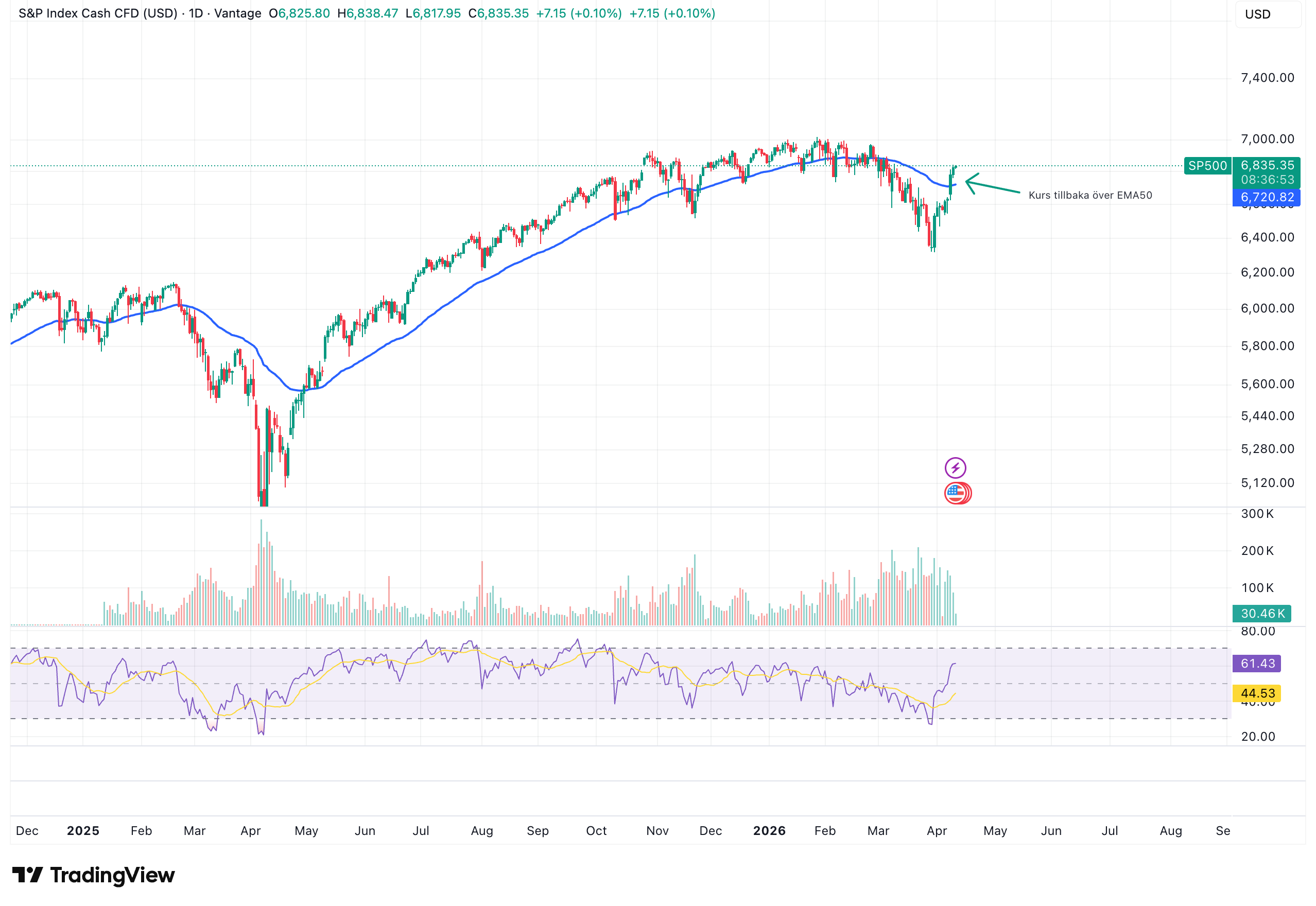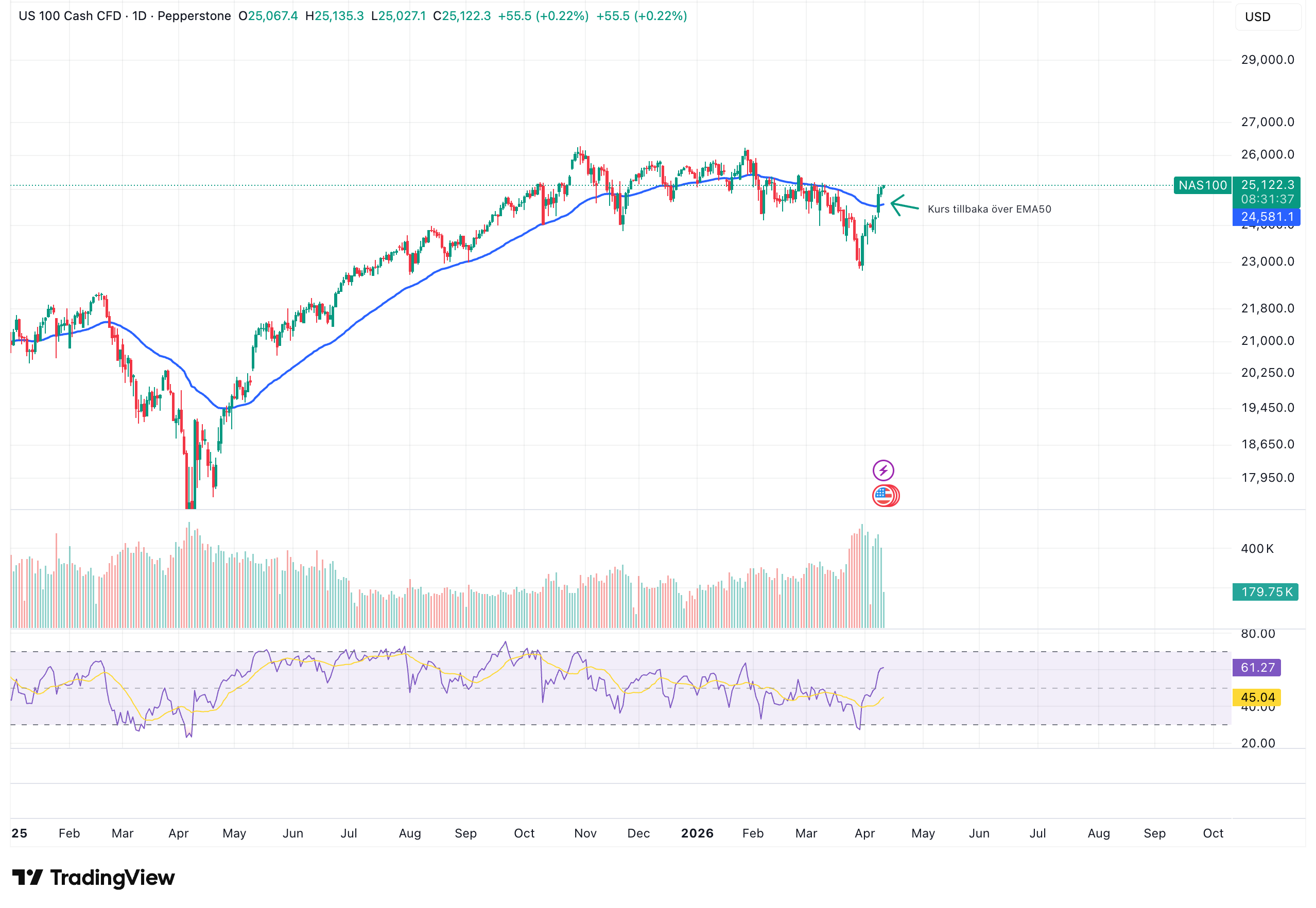 Återhämtningen i S&P 500 har varit tillräckligt kraftfull för att indexet tagit sig upp över EMA50, vilket indikerar att en mer varaktig botten potentiellt kan vara satt, givet utvecklingen i Iran. Indexet närmar sig nu tidigare all time high, vilket kan lägga grund för en mer sidledes rörelse innan nästa riktning etableras.