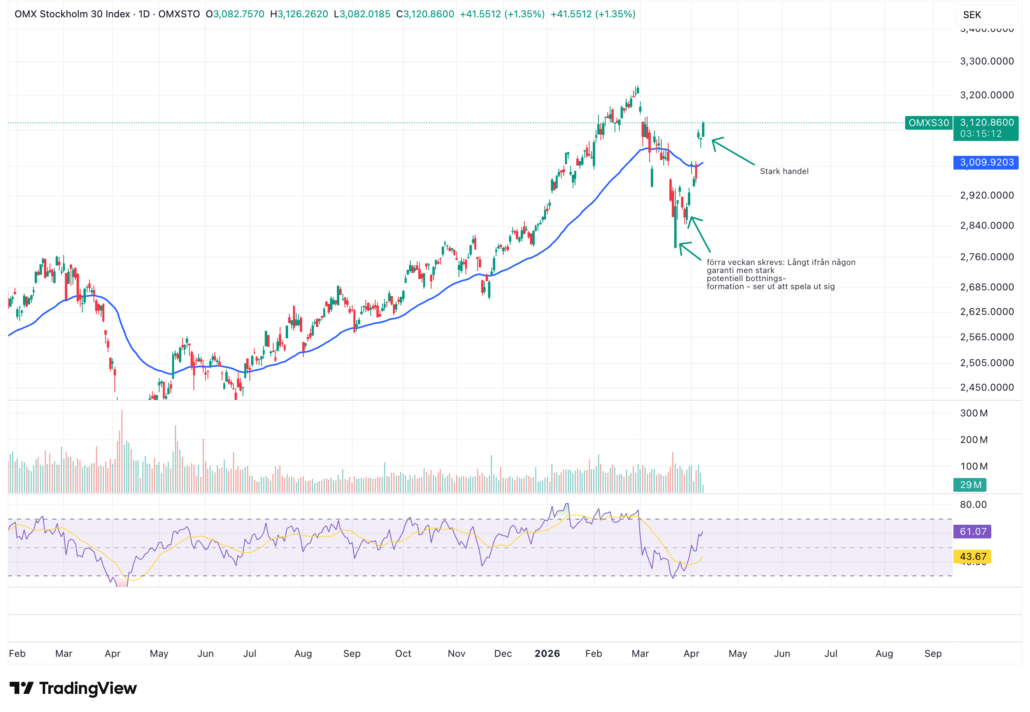OMXS30 handlades relativt starkt redan innan vapenvilan och har i samband med den senaste rörelsen tagit sig upp över EMA50. I grunden drivs även detta index av samma faktorer som övriga tillgångsslag, där utvecklingen i Iran fortsatt är avgörande.