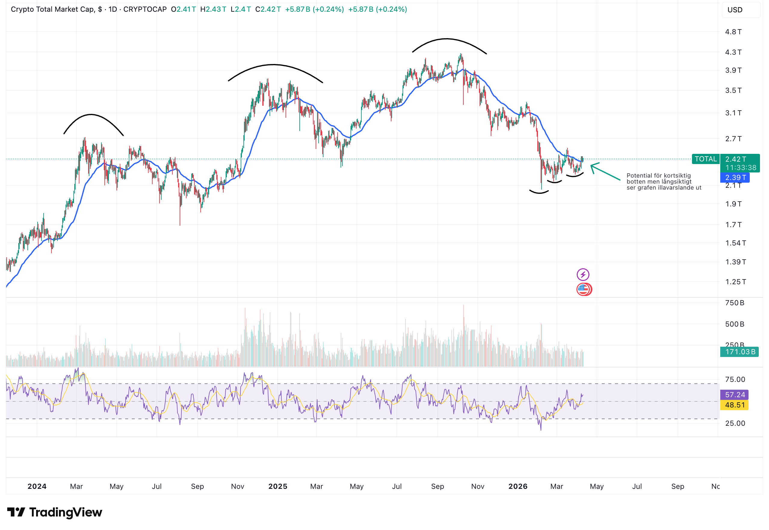 En anmärkningsvärd datapunkt är att krypto handlas väsentligt svagare än såväl börsindex som metaller. Historiskt har krypto ofta rört sig i linje med Nasdaq, där ökad riskvilja sammanfallit med stigande priser, men den relationen är i dagsläget svagare. På kort sikt finns tecken på att en botten kan vara under uppbyggnad, men i ett större perspektiv framstår strukturen fortsatt som svag.