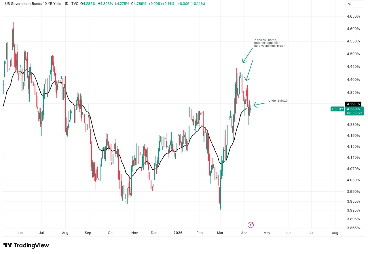 Vi har sett en hög korrelation mellan den amerikanska 10-årsräntan och oljan sedan Irankrigets inledning. Givet utfallet med pausade attacker föll räntan, inte oväntat, ned under EMA20.