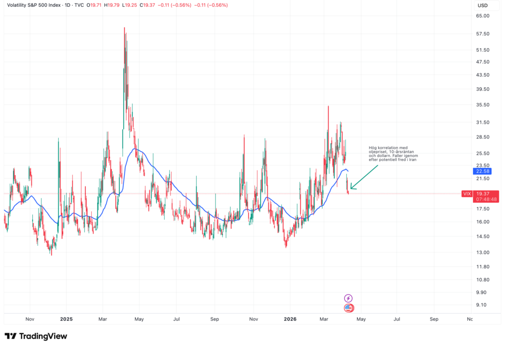 Rent tekniskt ser VIX-index fortsatt svagt ut och indikerar därmed ett mer gynnsamt börsklimat framåt. Samtidigt kvarstår den binära bilden, där mer negativa nyheter från Iran snabbt kan överskugga den nuvarande marknadsbilden och driva volatiliteten upp igen.