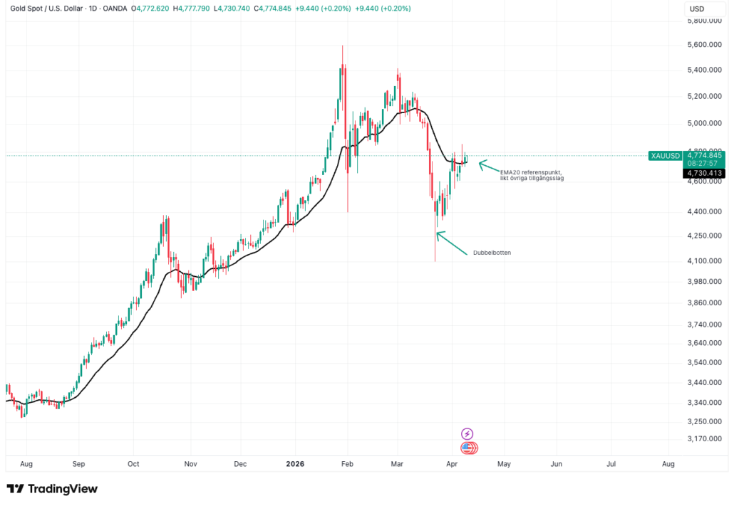 Guld har uppvisat ett omvänt förhållande jämfört med övriga tillgångar. Till skillnad från olja, räntor och dollar handlades guldet tidigare under EMA20, men har i samband med den senaste utvecklingen brutit upp över. Rörelsen illustrerar tydligt den binära marknadsbilden.