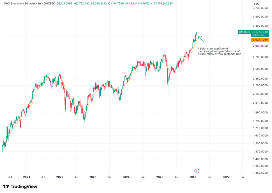 De senaste veckorna har präglats av hög volatilitet, särskilt bland enskilda aktier, såväl stora som små. Mot denna bakgrund är det något förvånande att de breda indexen i USA och Sverige (med undantag för First North) fortsatt handlas i långsiktiga uppåttrender. Detta kan till stor del förklaras av en pågående rotation mellan olika sektorer.