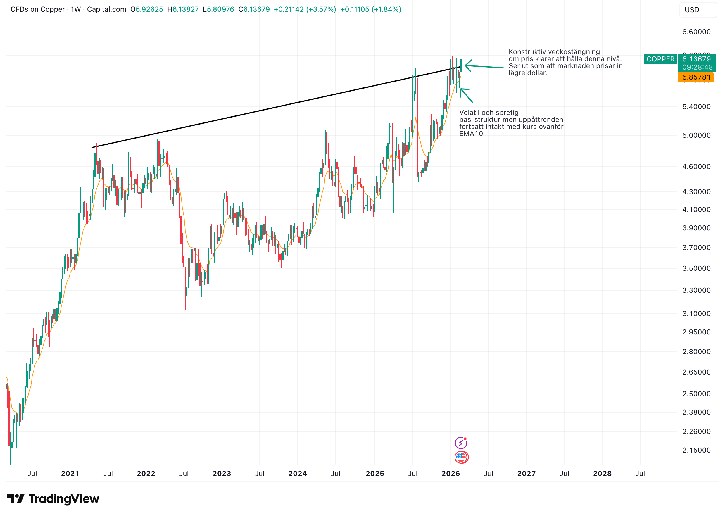 Prisets volatilitet speglar den osäkerhet som råder kring den globala tillväxten de kommande åren. Än så länge är uppåttrenden intakt där kursen etablerat sig ovanför EMA10.