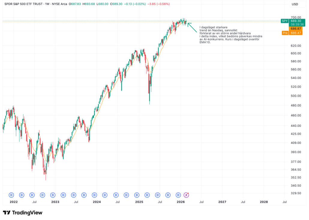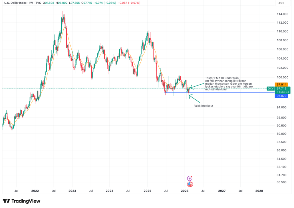 Även om hotbilden mot SaaS-relaterade bolag har fått störst genomslag i nyhetsflödet, har en potentiellt mer betydelsefull utveckling skett i den amerikanska tioårsräntan. Denna har rört sig sidledes under flera år men visar nu tecken på att bryta ned. Om utvecklingen består kan det få konsekvenser för såväl dollarn som aktieindex och metaller.