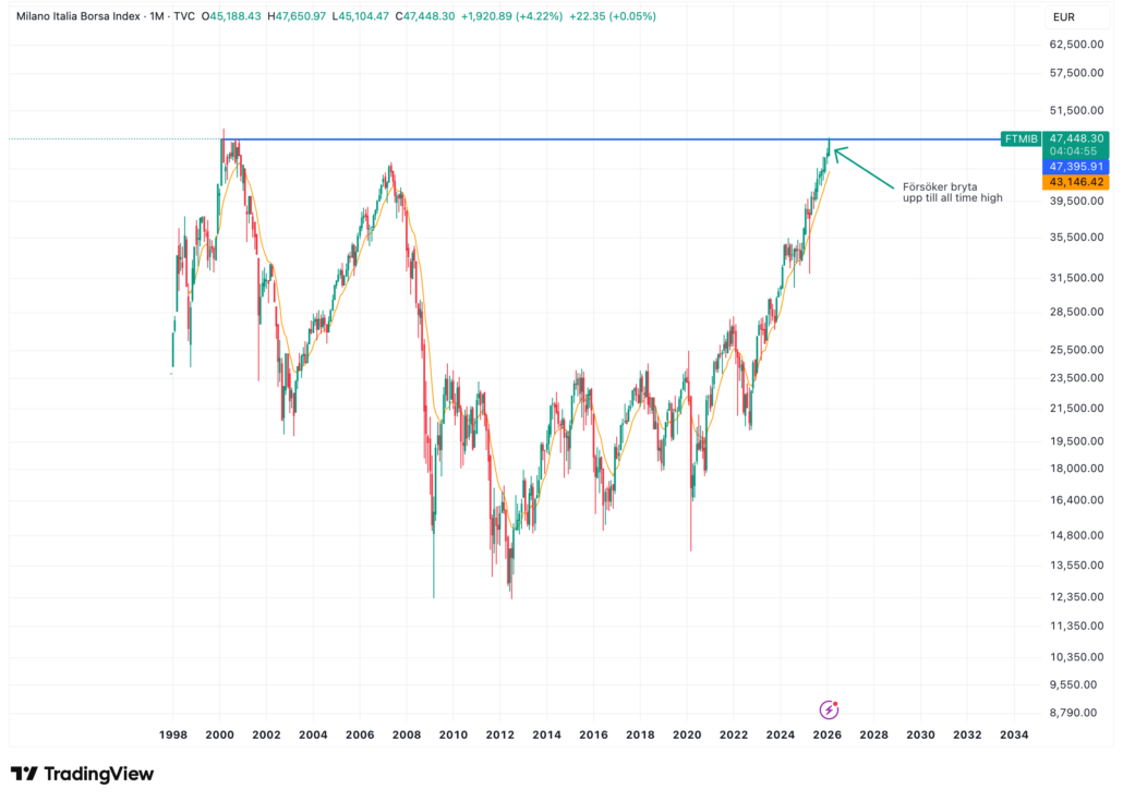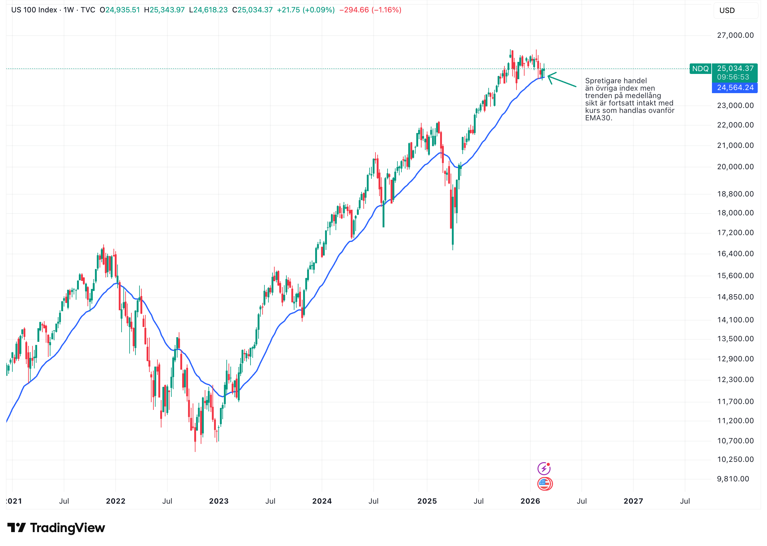 Trots negativa nyheter är de långsiktiga uppåttrenderna i flera amerikanska index fortsatt intakta. Small cap uppvisar relativ styrka i USA, medan motsatt mönster råder i Sverige. OMXSPI har utvecklats starkt men släpar efter flera sydeuropeiska index. Dollarns och den amerikanska tioårsräntans utveckling framstår som centrala variabler framåt, med potentiellt bred påverkan på riskaptit, finansieringskostnader och tillgångspriser.