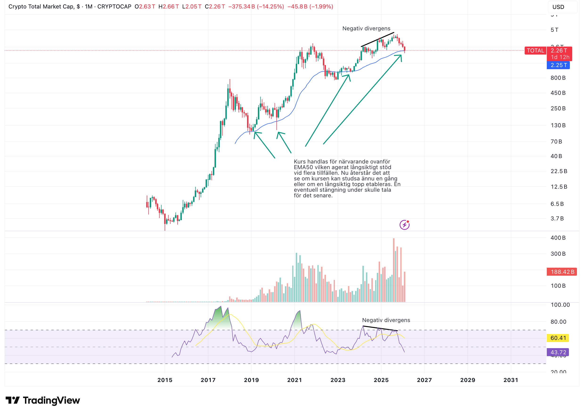 Råvaror, särskilt metaller, stöds av strukturella underskott och makrofaktorer, medan oljan i högre grad styrs av utbudsbalans och geopolitisk risk. Krypto har utvecklats svagt i linje med andra risktillgångar och dess långsiktiga trend är ifrågasatt. Sammantaget är den övergripande trenden på flera håll intakt, men riskbilden har blivit mer komplex.