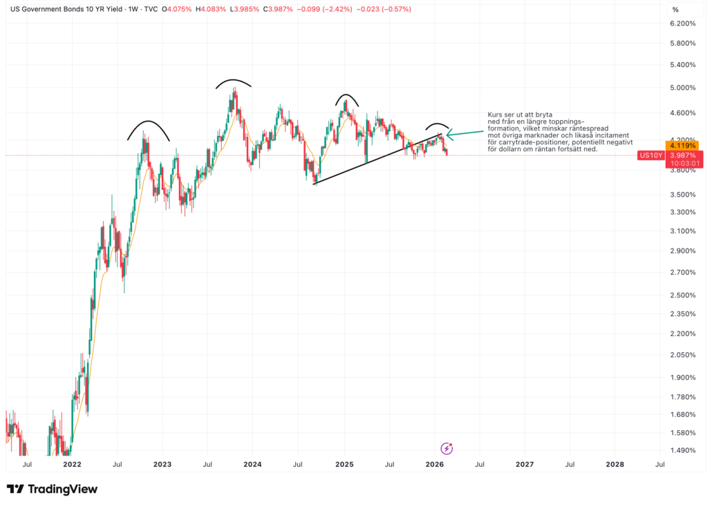 Den amerikanska tioårsräntan uppvisar i ökande grad tecken på att vara på väg att bryta ned. Sedan 2023 har en toppformation utvecklats, med en relativt tydlig head and shoulders-struktur.